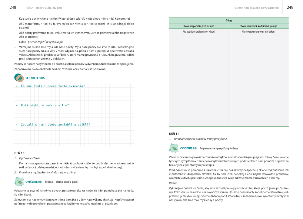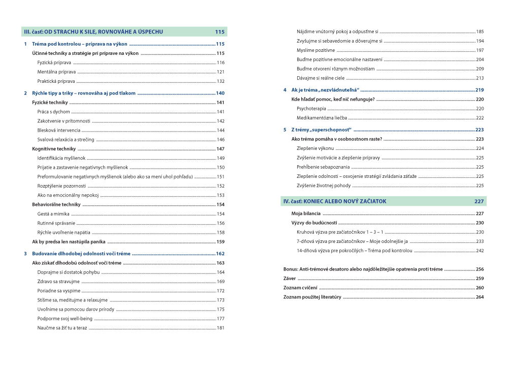 • 86 praktických cvičení a rád, tipy, triky a výzvy rôznej náročnosti na zvládnutie akútnych prejavov trémy
